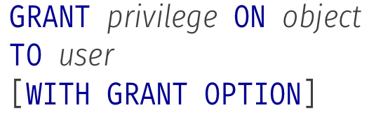 WITH GRANT OPTION : user can also grant the privileges to other users