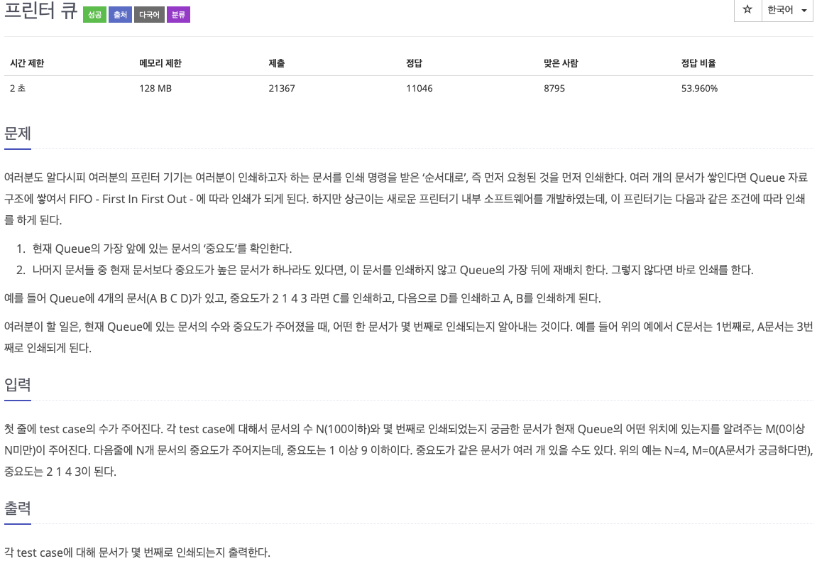 이 문제의 경우는 위의 문제와 다르게 가장 앞에 있는 원소를 먼저 체크하는 자료구조이므로 큐를 활용하는 것이다. 또한, 나중에 들어온 원소들은 뒤로 배치함으로써 이 부분도 FIFO구조를 만족한다. 이러한 부분에서 큐를 활용한다는 느낌을 잡으면 된다.