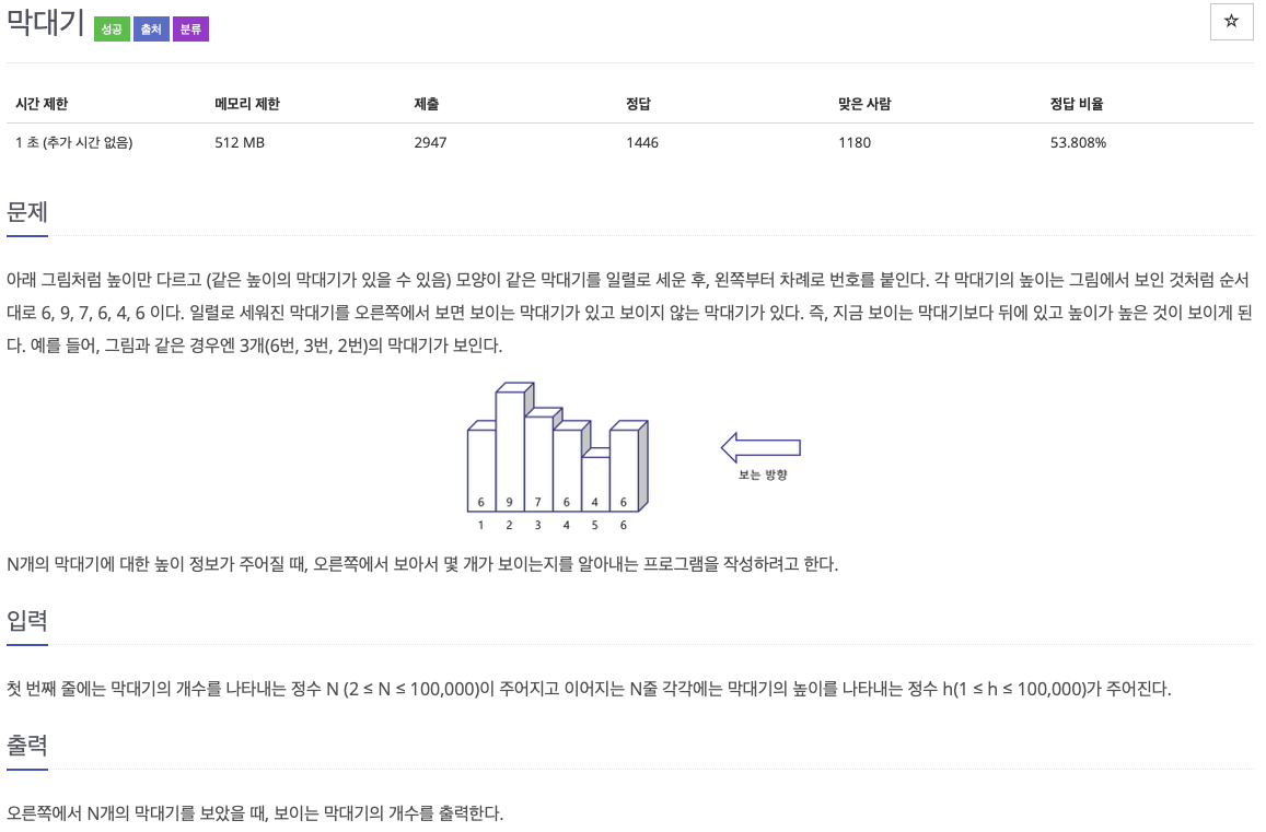 이 문제의 경우는 왼쪽부터 차례로 번호를 붙이고 보는 방향은 오른쪽이라는 점에 집중해보자. 즉, 나중에 번호를 붙인 순서와 보는방향이 제일 가깝다. 즉 이 지점에서 스택 유형임을 알아내야 한다. 문제 자체는, 현재 본인의 숫자보다 더 큰 숫자가 나올때까지 pop시키는 과정을 반복하면 된다.